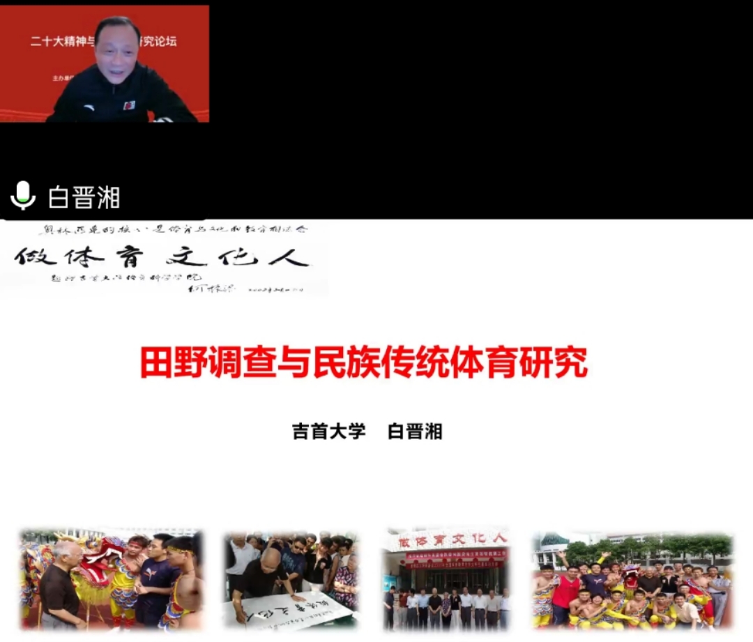 白晋湘教授以《田野调查与民族传统体育研究》为题结合自己的亲身经历,深入浅出讲解了田野调查方法以及如何选择田野调查的主题及研究,为我们更好地做好科学研究提供了重要的启示和借鉴。